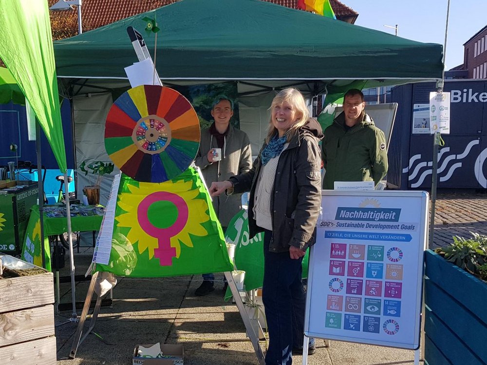 Besonderes Interesse weckte ein von Ina Ecks konzipiertes Glücksrad zu den 17 globalen Nachhaltigkeitszielen der Agenda 2030. "Unser interaktives Angebot ermöglichte es den Jugendlichen, sich spielerisch mit den globalen Nachhaltigkeitszielen auseinanderzusetzen", erläutert Ina Ecks. "Es konnte so oft gedreht werden, wie Gruppen oder einzelne Personen Fragen gestellt bekommen wollten. Preise gab es, waren aber weniger wichtig als der Aha-Effekt bei den Fragen und der manchmal unerwarteten Antworten", so Ina Ecks.