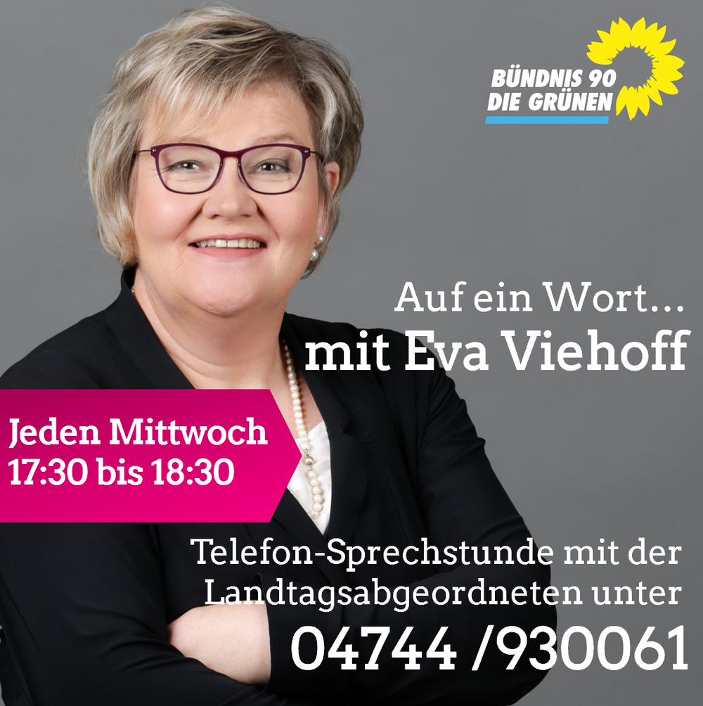 Auf ein Wort...mit Eva Viehoff, jeden Mittwoch von 17:30 bis 18:30 Uhr Telefonsprechstunde mit Eva Viehoff (Grüne Landtagsabgeordnete), die aus dem Landkreis Cuxhaven auch den Landkreis Stade betreut.
