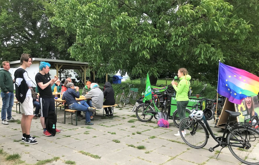 Martin Lüdders von der Grünen Jugend Stade ergänzte den Wahlaufruf mit dem Hinweis, für ein freies und buntes Europa der Demokraten einzutreten und den rechten Bestrebungen keinen Raum zu lassen. Er schafft in seinem Beitrag die Verbindung zum Protest gegen die geplante Autobahn A20 und fordert, die öffentliche Infrastruktur zugunsten von Bahn und Bus, aber auch von guten Radwegen auszubauen.