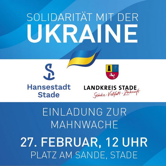 Ein Zeichen gegen den Krieg in der Ukraine will der Landkreis Stade zusammen mit der Hansestadt Stade setzen. Die Grüne Kreistagsfraktion und der Grüne Kreisverband schließen sich für Sonntag, 27. Februar, 12 Uhr, der Mahnwache auf dem Platz „Am Sande" an.