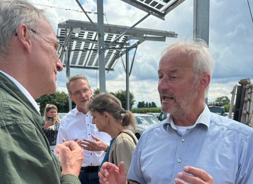 Mit dabei war der Grüne Stefan Wenzel, Parlamentarischer Staatssekretär beim Bundesminister für Wirtschaft und Klimaschutz. Bei sonnigem Wetter besichtigten die Teilnehmenden eine Demonstrationsanlage. Aus dem Kreisverband Stade begleiteten Britta Sanders, Co-Vorsitzende der Grünen Kreistagsfraktion und Ina Ecks (Mitglied im Grünen Kreisvorstand) den Cuxhavener Stefan Wenzel. Bei der Besichtigung wurde deutlich, dass anders als auf Hausdächern die Solar-Module über Obstbäumen und Beerenbüschen deutlich lichtdurchlässiger sind. Sie haben mehr als die Hälfte klarsichtige Anteile. Nach Ansicht der Grünen sollte die Kombination von Landwirtschaft und Agri-PV dort genutzt werden, wo sie eine Option ist. „Sie könnten im Obstbau beispielsweise auch Früchte vor hoher Sonneneinstrahlung schützen oder zur Lösung lokaler elektrotechnischer Lösungen in den Plantagen beitragen", so Ina Ecks.