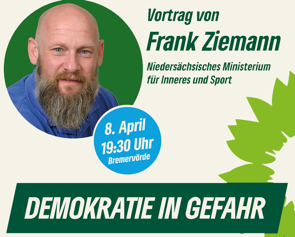 Am 08.04.2024 spricht Frank Ziemann, Referent im Niedersächsischen Ministerium für Inneres und Sport, in Bremervörde zum Thema „Demokratie in Gefahr“. Frank Ziemann arbeitet dort im Arbeitsbereich Prävention beim Verfassungsschutz. Die Diskussionsveranstaltung beginnt um 19:30 Uhr im Hotel Daub, Bahnhofstraße 2, 27432 Bremervörde.