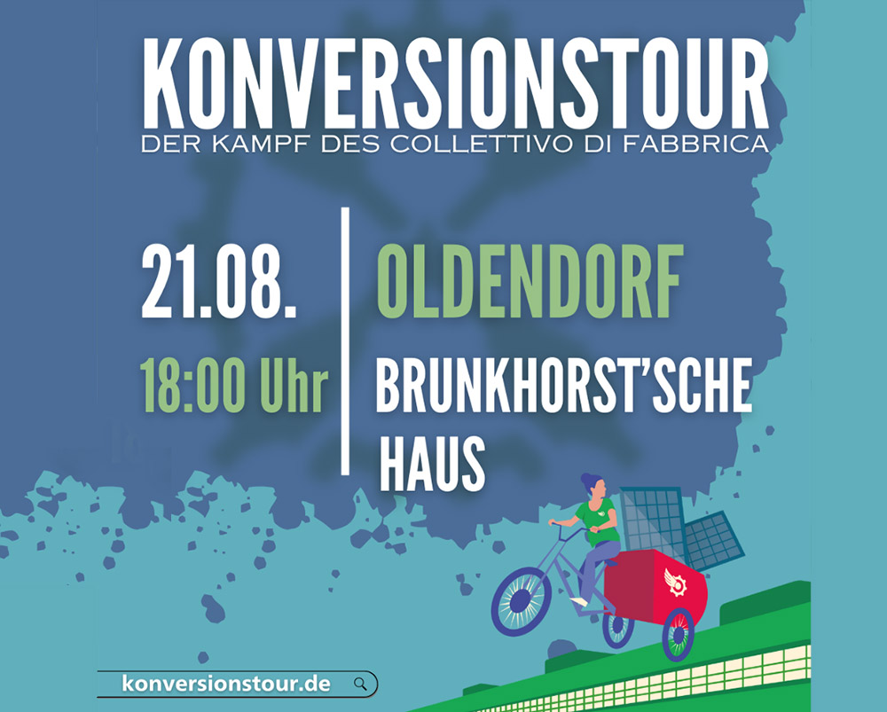 Seit 2021 kämpft die Belegschaft des Autozulieferers GKN in Italien um ihre Fabrik und ihre Jobs. Die Beschäftigten wollen statt Zulieferteile für Verbrennungsmotoren zukunftsfähige Teile herstellen. Sie haben begonnen, Lastenräder zu bauen und planen Solarmodule der neuesten Generation zu produzieren. Sie sind nun europaweit mit ihrer Konversionstour unterwegs und werben für ihre Sache.