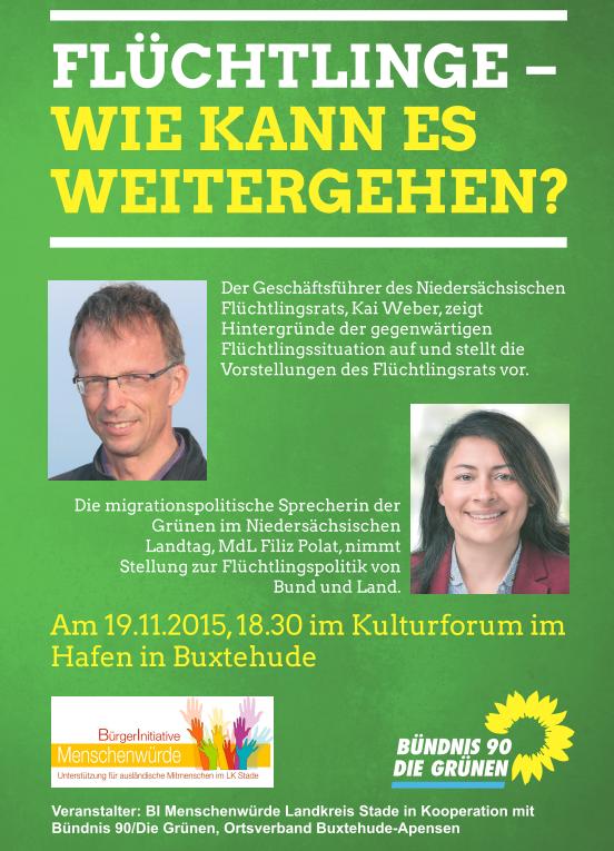 Seit dem Spätsommer dieses Jahres hat die Zahl der in Deutschland ankommenden Flüchtlinge drastisch zugenommen. Politik, Verwaltung und eine Vielzahl von ehrenamtlichen Helfern bemühen sich, die damit verbundenen Probleme zu bewältigen. Gleichzeitig wächst im politisch rechten Spektrum die Gegnerschaft zu einer Haltung, die Asyl als Menschenrecht auch in schwierigen Zeiten verteidigt. Die Bürgerinitiative "Menschenwürde Landkreis Stade" in Kooperation mit dem Ortsverband Buxtehude-Apensen von Bündnis 90/Die Grünen hat zwei hervorragende Kenner der Flüchtlingsproblematik eingeladen, über die Hintergründe der gegenwärtigen Flüchtlingssituation zu informieren, die offizielle Flüchtlingspolitik im Bund und in den Ländern kritisch zu analysieren und ihre eigenen Vorschläge zum Umgang mit den praktischen Problemen vor Ort zur Diskussion zu stellen: Kai Weber ist der Geschäftsführer des Niedersächsischen Flüchtlingsrats, einer weithin angesehenen Nichtregierungsorganisation; Filiz Polat, MdL, ist die migrationspolitische Sprecherin der Grünen im Niedersächsischen Landtag.