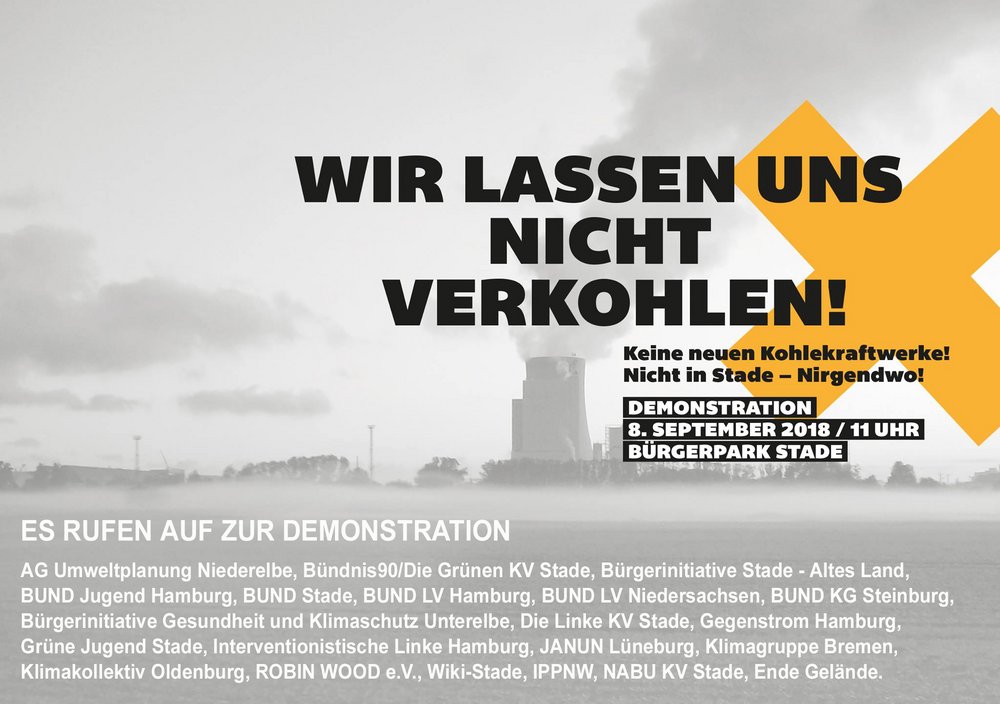 Diesem klimapolitischen Wahnsinn werden wir nicht tatenlos zusehen! Um das Kohlekraftwerk in Stade zu verhindern, heißt es jetzt weiter Druck machen. Kommt mit uns am 8.9. auf die Straße!