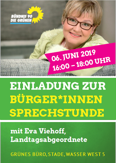 Eine Bürgersprechstunde bietet die Grüne Landtagsabgeordnete Eva Viehoff am Donnerstag, den 6. Juni von 16:00 bis 18:00 Uhr in Stade an. Die Cuxhavenerin Viehoff betreut als Landtagsabgeordnete auch den Landkreis Stade. Ihre Sprechstunde bietet sie in dem Grünen Büro an, 1. Stock Wasser West 5. Eva Viehoff ist in ihrer Fraktion die Sprecherin für Wissenschaft & Hochschulen, Kultur, Erwachsenenbildung, Denkmalschutz, Arbeitsmarkt, Tourismus, Religion und Eine-Welt-Politik.