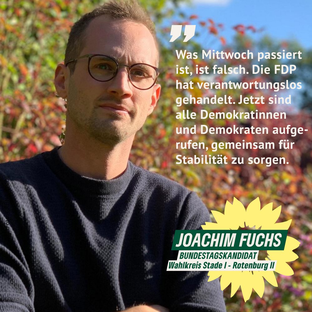 Joachim Fuchs, Grüner Direktkandidat für die Bundestagswahl im Wahlkreis Stade I / Rotenburg II erklärt dazu: „Was Mittwoch passiert ist, ist falsch. Die FDP hat verantwortungslos gehandelt. Jetzt sind alle Demokratinnen und Demokraten aufgerufen, gemeinsam für Stabilität zu sorgen.“