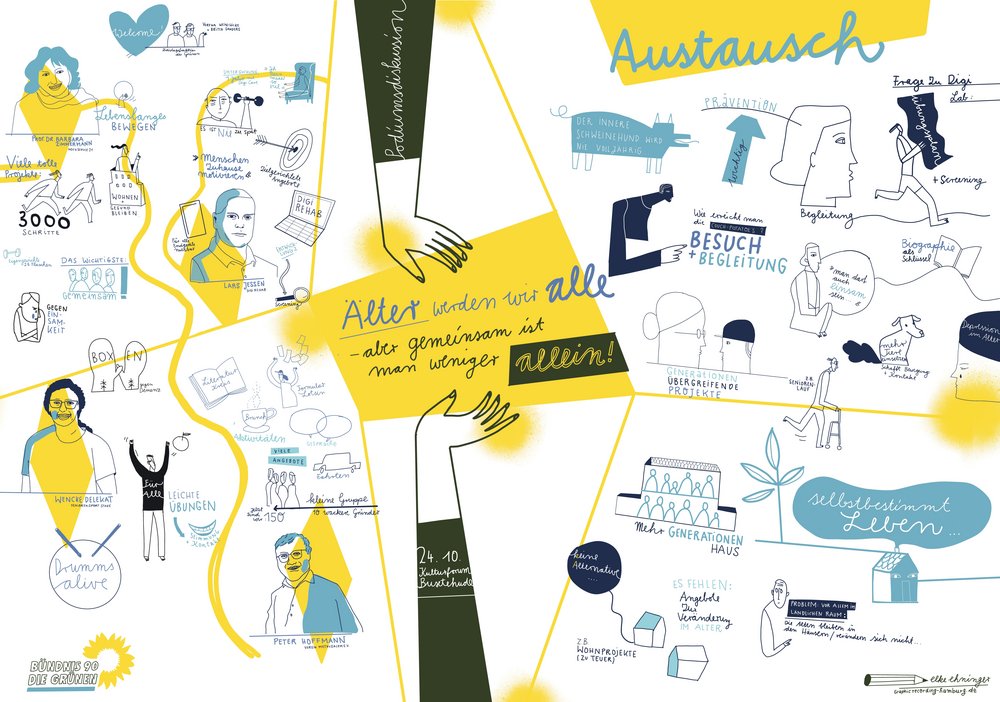 Am 24.10.2024 lud die Kreistagsfraktion von Bündnis 90/Die Grünen zu einer Podiumsdiskussion in das Kulturforum in Buxtehude ein. Auf dem Podium saßen Frau Prof. Dr. Barbara Zimmermann von der Hochschule 21, Lars Jessen, Geschäftsführer von DigiRehab, Wencke Delekat vom Seniorensport Stade und Peter Hoffmann, der den Horneburger Verein “Methusalem” vorstellte. Im Schwerpunkt standen die Themen Bewegung im Alter, Einsamkeit und Nachbarschaft. Rund 50 Interessierte kamen, um gemeinsam die eigene Beweglichkeit zu überprüfen und Übungen kennenzulernen, die man ohne besondere Geräte selbstständig zu Hause durchführen kann. Ziel ist, möglichst lange die Eigenständigkeit in den eigenen vier Wänden zu erhalten. Prof. Dr. Zimmermann stellte das 3.000 Schritte Programm vor, das nicht nur fit hält, sondern auch Aktivität und Austausch in Gemeinschaft ermöglicht. Der Verein Methusalem bietet neben Literaturkreis, Spielerunden und Vorträgen auch ganz praktische Hilfestellungen vor Ort an. Lars Jessen von DigiRehab berichtete von einem Gesundheits-Präventionsprogramm, das in Dänemark erfolgreich in den Kommunen eingesetzt wird. Wege, um den inneren Schweinehund zu überwinden wurden aufgezeigt. Auch generationsübergreifende Aktivitäten stellte Wencke Delekat vom Seniorensport Stade vor. Das Publikum beteiligte sich rege am anschließenden Austausch. Deutlich wurde, dass gerade im ländlichen Raum Angebote zur Veränderung im Alter fehlen oder nicht bekannt sind, ärztliche Versorgung weite Wege erfordert, Wohnprojekte oft nicht umsetzbar und finanzierbar sind.